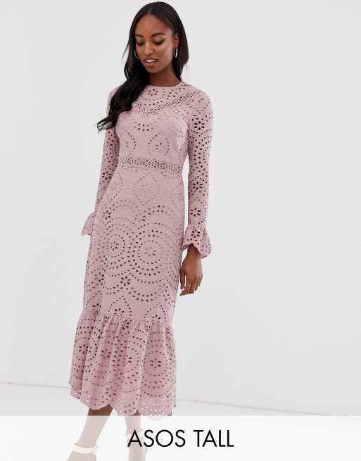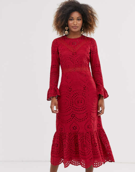 Asos design premium broderie maxi dress outlet with pep hem and fluted sleeves