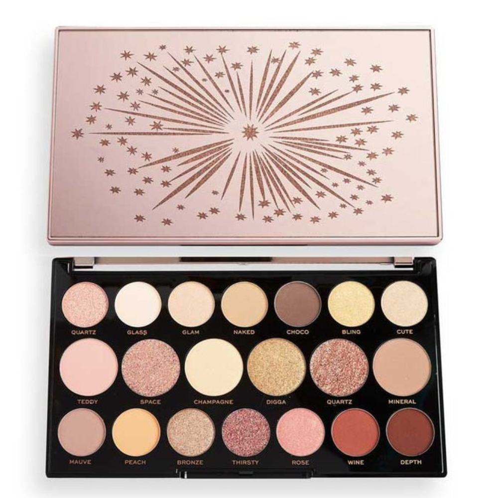 Precious Glamour MegaStar Eyeshadow Palette by Revolution. The Precious Glamour collection evokes the glamor of the 90s, filled with ornaments, stars and butterflies. The Precious Glamour Megastar Diamond Edition eyeshadow palette contains 20 shimmer finish shadows in rose gold, bronze and champagne tones, combined with other neutral and nude shades with matte finishes. Discover the entire Precious Glamour collection and get a most glamorous look.